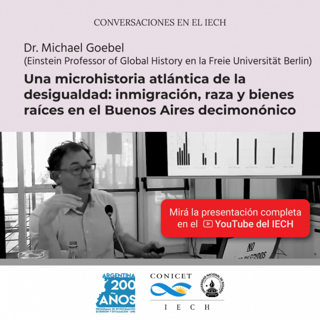 Ya está disponible la grabación de la conferencia "Una microhistoria atlántica de la desigualdad: inmigración, raza y bienes raíces en el Buenos Aires decimonónico” a cargo del Dr. Michael Goebel (Einstein Professor of Global History en la Freie Universität Berlin) dictada el pasado 2 de marzo en el Instituto de Estudios Críticos en Humanidades.